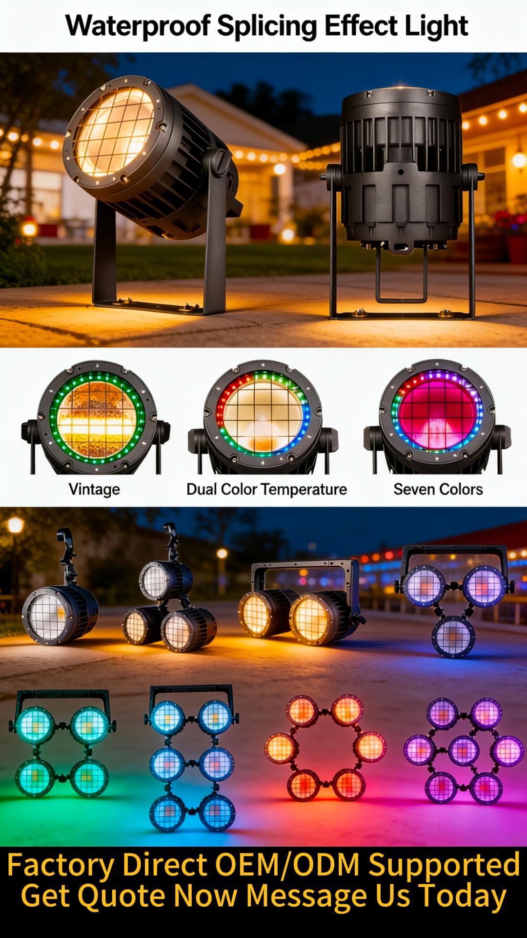 Waterproof Splicing Effect Light IP65 protection rating Full pressure cast aluminum chassis,waterproof for the entire machine Display: LED display operation panel, supporting switching between Chinese and English Choose from 3 light source combinations Dual color temperature light source Retro effect Full color LED light source Single eye multi eye infinite splicing continuous stable power Multiple installation methods The buckle installation is convenient and stable Adjustable angle splicing Buckle adjusimenl, precise and smooth angle control Single eye multi eye infinite splicing